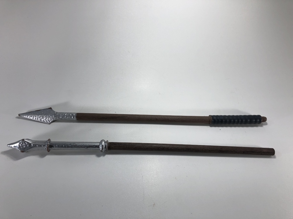 Costume, hollow plastic spear for costume, cosplay or decor in any video production. It is pretty cheap looking, but in a background shot, it might be OK. Or an action shot where it is being thrown would take away the detail.