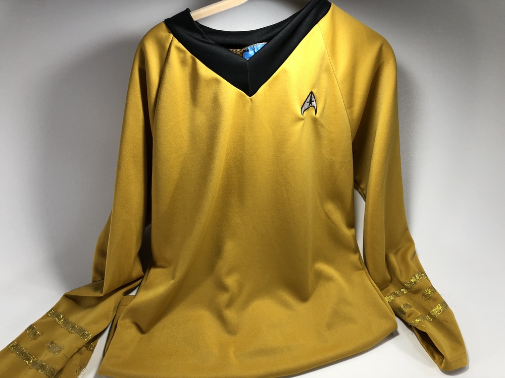 This is a polyester Captain Kirk Star Trek Uniform Shirt in size medium. We also have an extra large Spock shirt. These are from the original series from the 60's and not any of the newer installments.