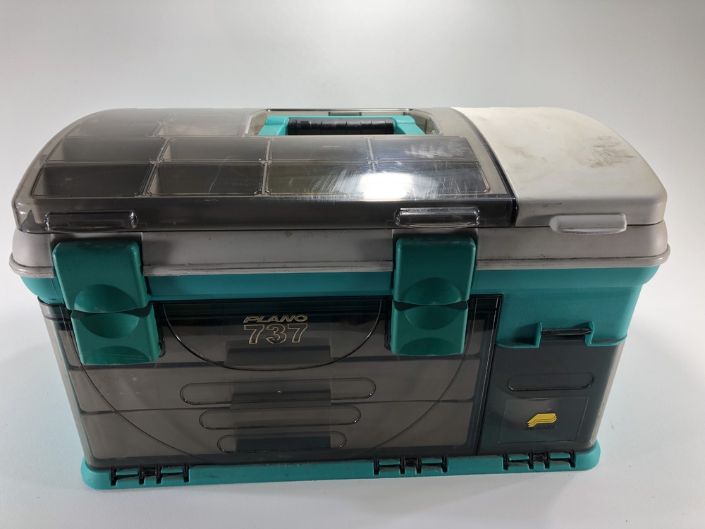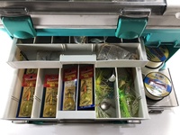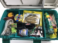 This tackle box is used, authentic and loaded with modern tackle ready for any fishing trip. Full of colorful and exciting lures, bobbers and tools that would be expected.