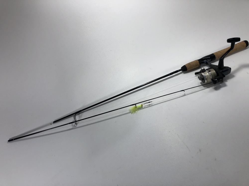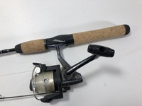 Small fishing combo open faced spinning real and carbon fiber pole using ultralight tackle.