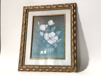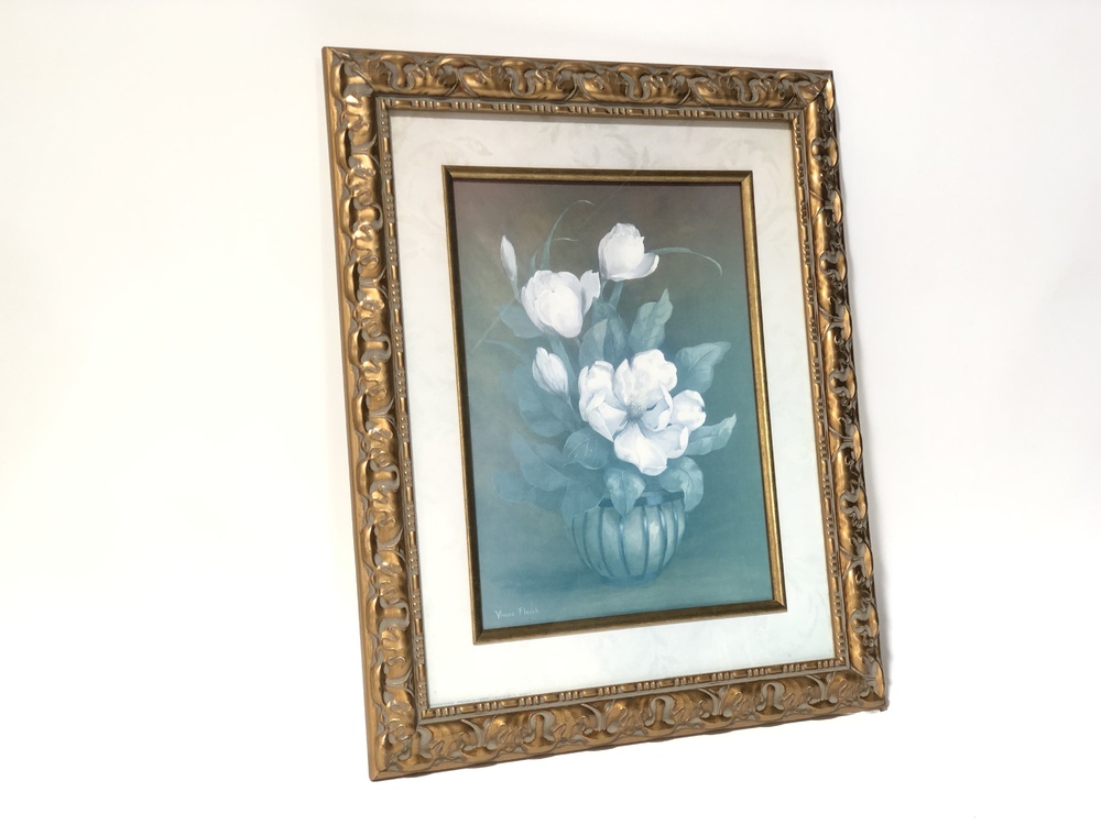 A large gold picture frame with a painting of white flowers in a small vase.