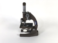 This is an older microscope likely from a high school science lab. Beige color, rotating mirror for light direction and 3 lenses on turret.