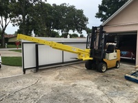 We have a large extendable boom for lifting heavy objects away from the forks and suspending them above the ground. We also have a basket for supporting up to 2 people lifted to about 14' above the ground.