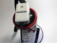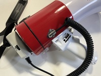 Uses USB charger and can play mp3 files or amplify spoken voice. Has a siren mode for police siren.