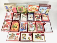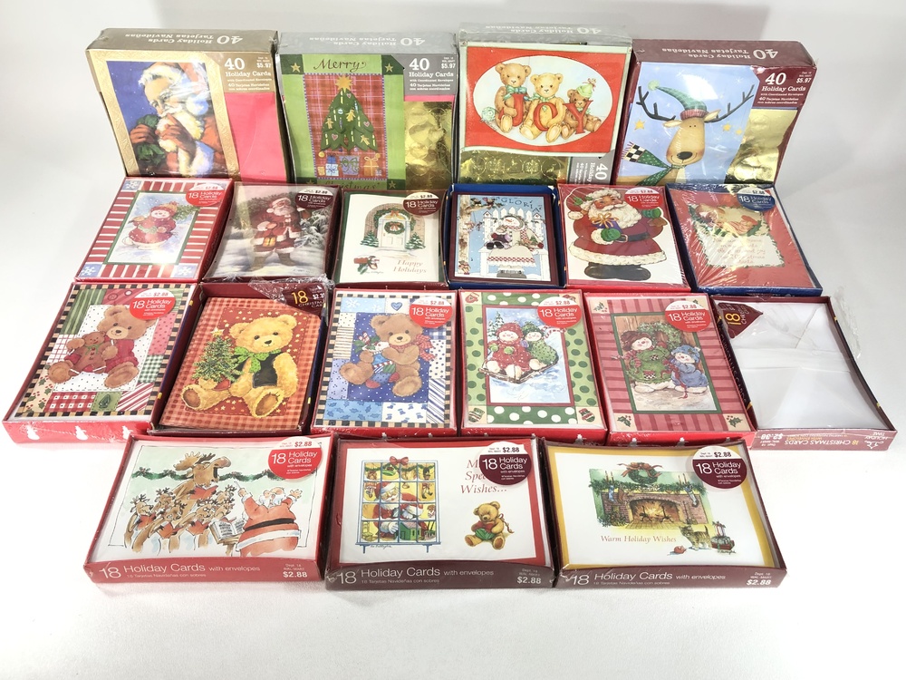 The assortment of Christmas cards represents a diverse array of festive designs commonly used as props in film and video productions. These cards feature classic holiday themes such as Santa Claus, teddy bears, snowmen, and various other cheerful scenes.