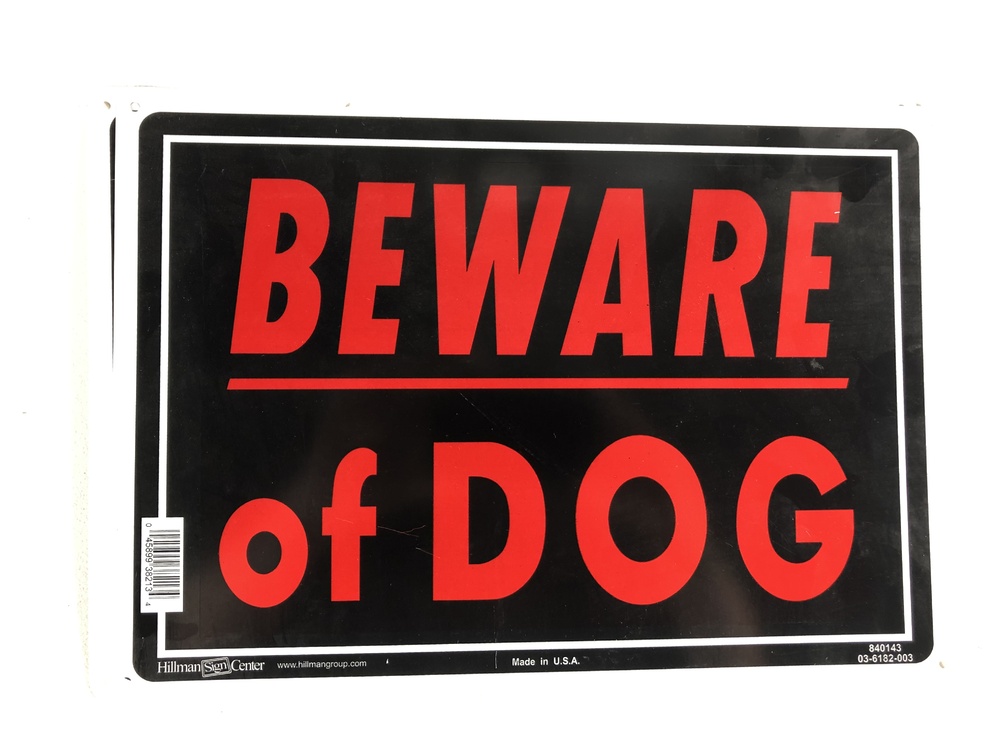 Typical hardware store sign in plastic, several available. Bring your bad ass barking dog to work and rile him or her up behind our 8' tall chain link gates with a couple of these "Beware of Dog" signs and you will have a bad ass movie shot.