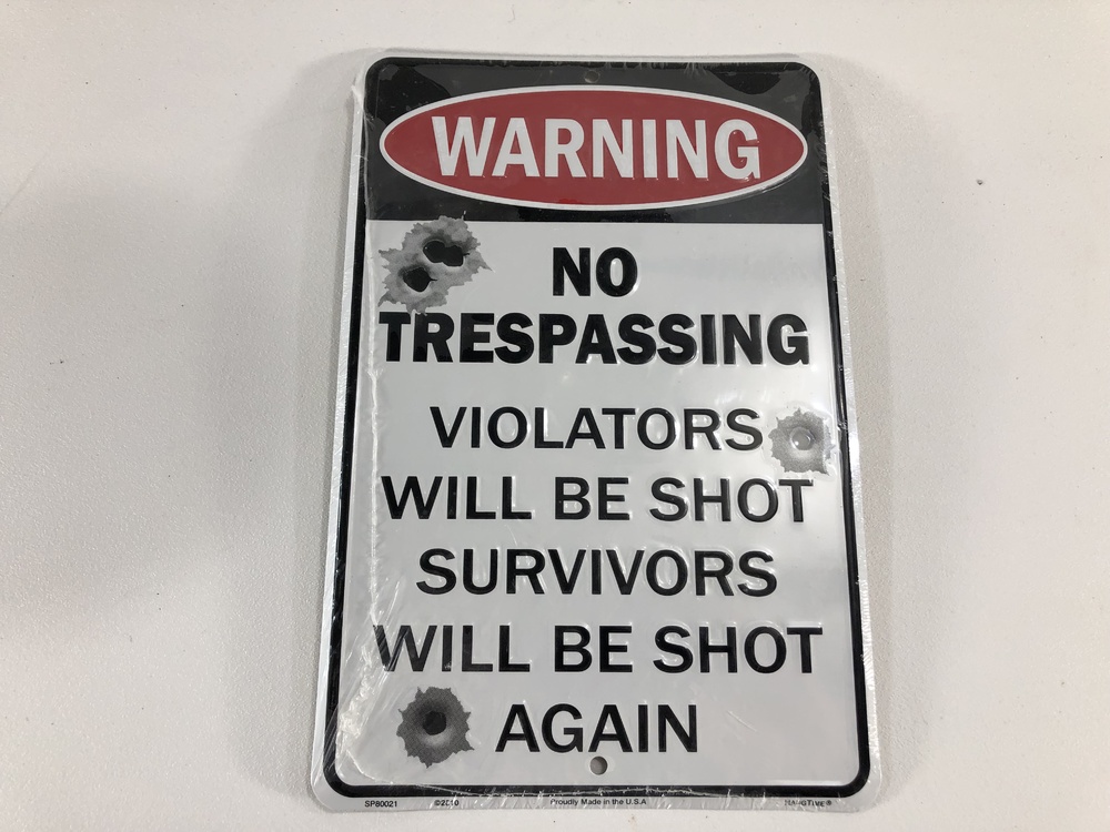 The sign reads, WARNING (in bold), No Trespassing, Violator will be shot, survivors will be shot again. The sign has fake bullet holes in it to make the point.