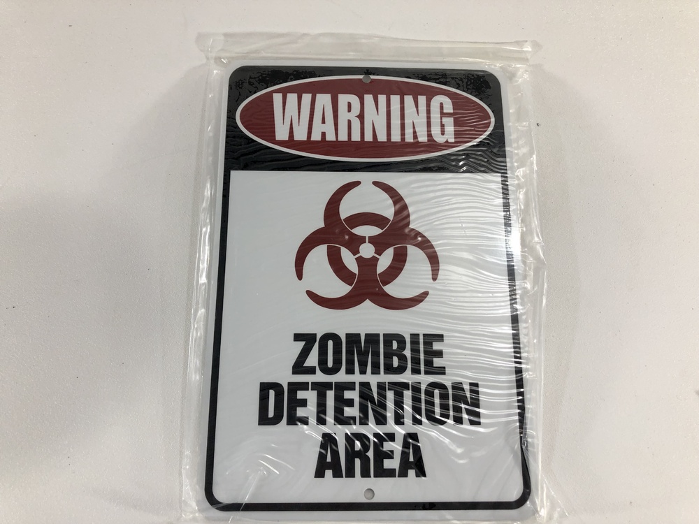 Part of a large collection of signs from stop signs to "Do Not Feed The Zombies". This zombie detention area sign is great for a man cave or a real zombie movie where a lab is holding zombies for research.