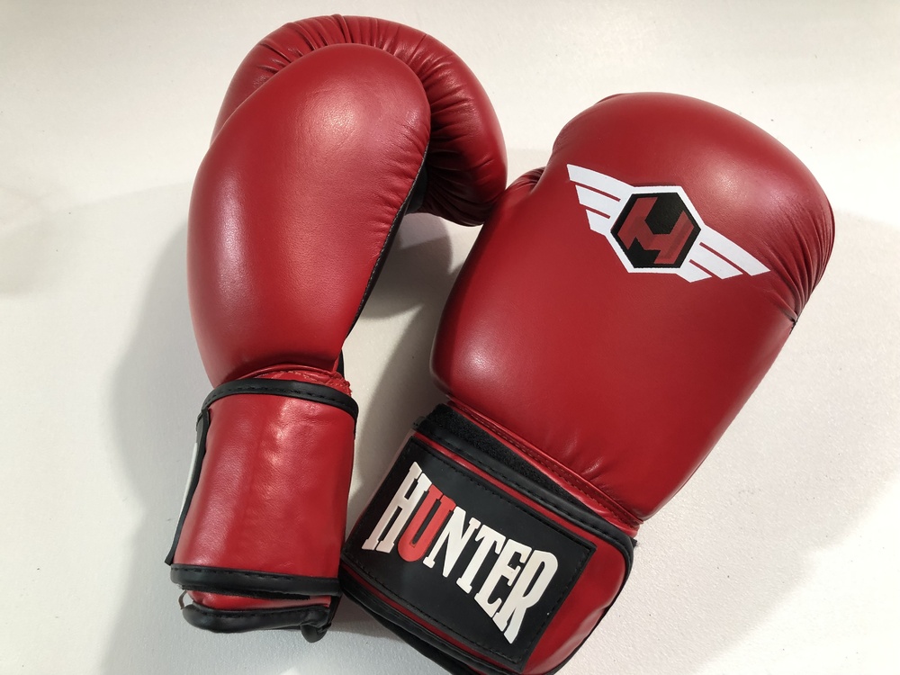 Hunter Red 16 ounce boxing gloves ready for your "Rocky Remake" or any video or film that has a boxing scene.